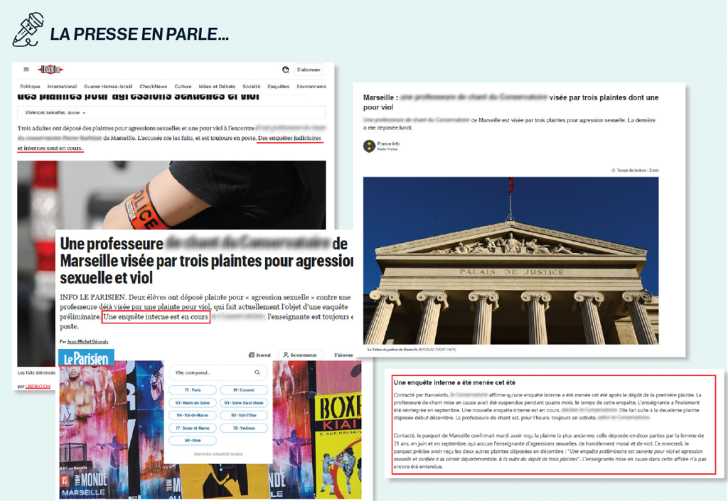 Dans un second temps, d’autres élèves s’étaient plaints de nouveaux agissements de ce professeur, constitutifs de harcèlement sexuel et d’agression sexuelle ainsi que de comportements globalement inappropriés. Un climat délétère était entretenu par des articles de presse écrite et des reportages radio et télévisés faisant état des diverses plaintes.